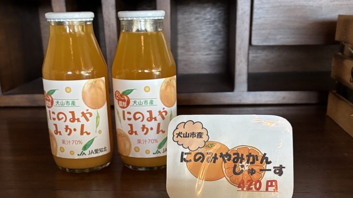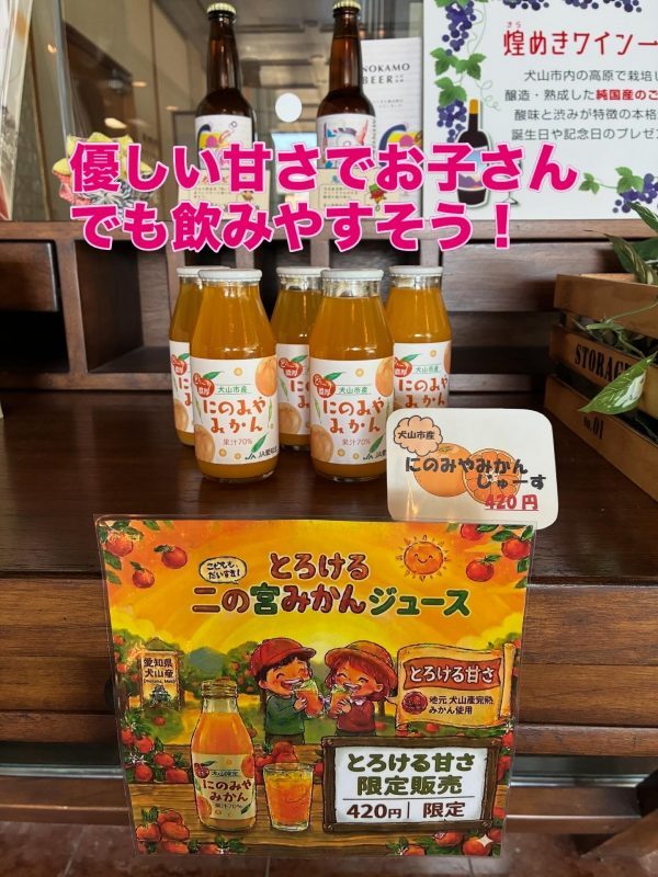 犬山で生産されたみかん「二の宮みかん」で作られたジュースをフロントで販売しています。