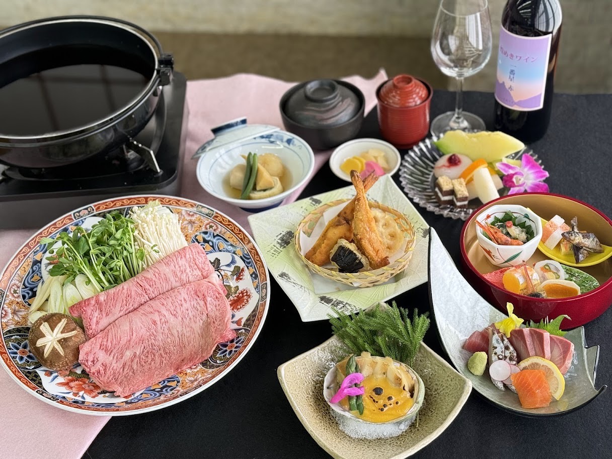 季節の食材を使った会席料理に海の幸と特選牛肉がついた当館最高級のフルコースをご用意致します。