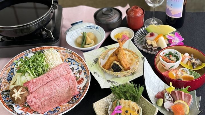 会席料理のフルコースに海の幸と特選牛肉が付いた贅沢プランです。